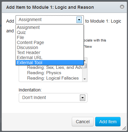 - Choose the External Tool that you created above and then enter the URL to one of the Lincoln speeches. For example, http://provider.azurewebsites.net/Tool/1.