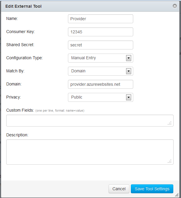- Fill in all the fields as shown (using whatever key and secret you want) and then save the tool settings.