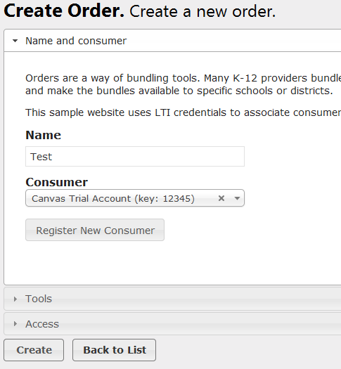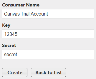 - Fill in all the consumer fields, using the same key and secret as you used in Canvas, and then click on Create.