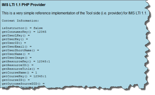 When you click on the link or button, you should see IMS LTI™ test tool appear and display details of your request: